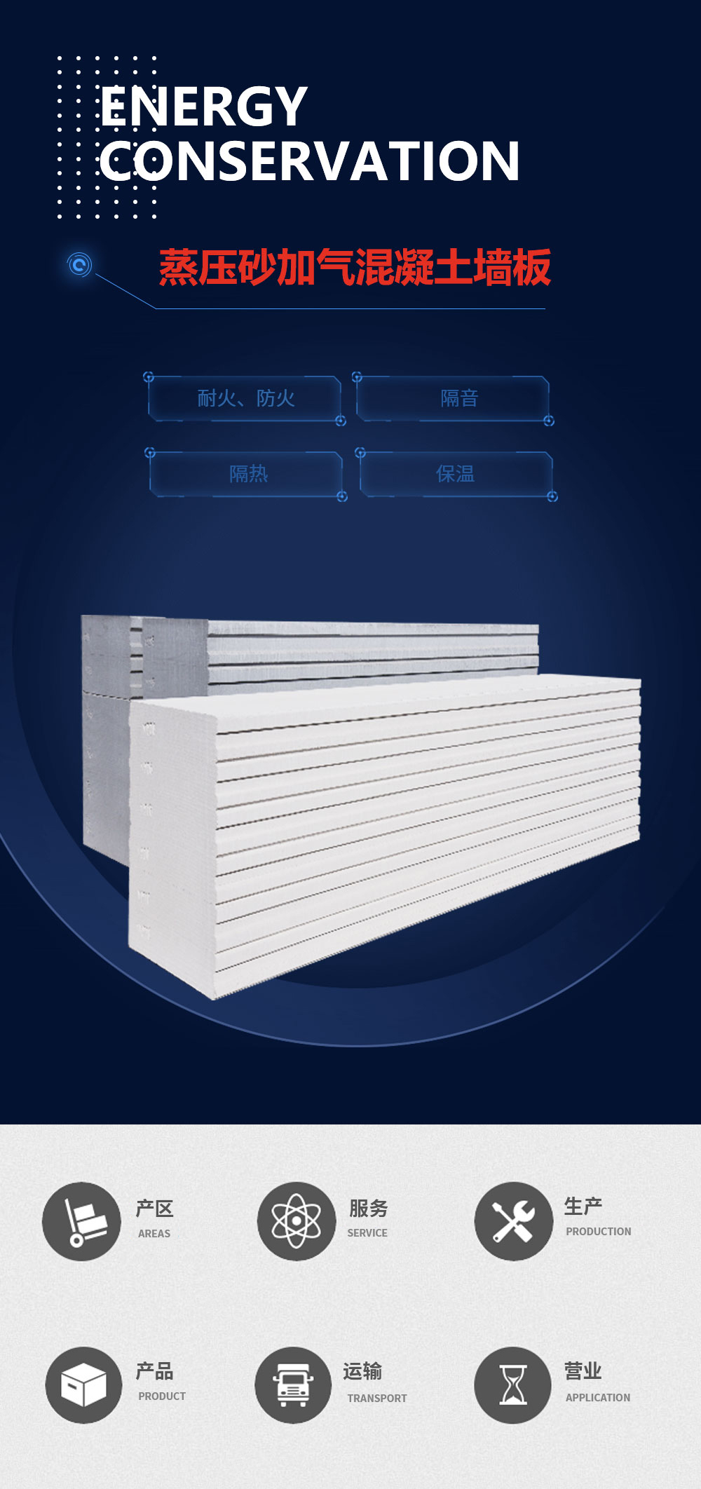 蒸壓加氣混凝土板材是以硅砂(粉煤灰)、水泥、石灰為主要原料,由經過防銹處理的鋼筋增強,經過高溫、高壓、蒸汽養護而成的多氣孔混凝土制品。其隔音與吸音性能俱佳,具有很好的耐火、防火、隔音、隔熱、保溫等性能;輕質性比重為0.5,是普通混凝土的1/4,降低了墻體的自重,減低建筑物基礎造價。產品有外墻板、內墻板、樓層板和屋面板。